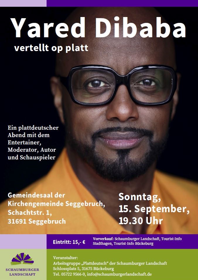 Um 19:30 Uhr findet zudem ein Plattdeutscher Abend mit dem bekannten Entertainer, Moderator, Autor und Schauspieler Yared Dibaba im Gemeindehaus der Kirchengemeinde Seggebruch statt. Eintrittskarten können Sie bei der Tourist-Info Stadthagen, der Tourist-Info Bückeburg sowie in der Geschäftsstelle der Schaumburger Landschaft erwerben.